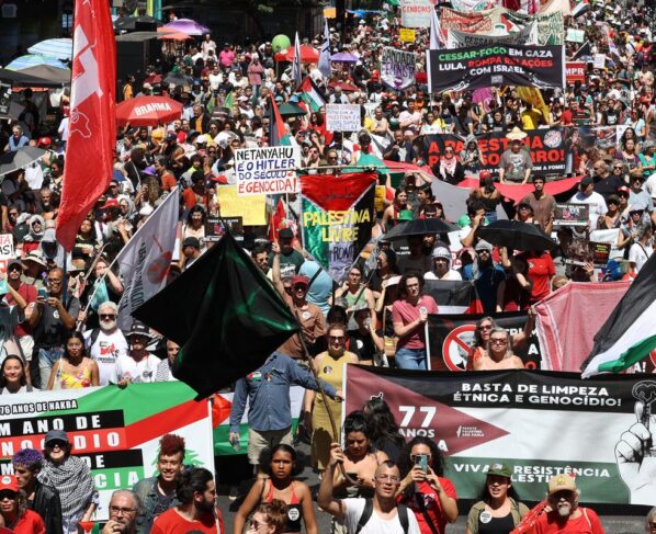 “É um absurdo que o governo brasileiro continue exportando petróleo e aço para um Estado assassino, genocida, e a única possibilidade de paz no Oriente Médio é que esse Estado que usa métodos, inclusive, nazistas seja eliminado e que exista uma Palestina livre do rio ao mar, como é a reivindicação de praticamente 100% dos manifestantes aqui presentes”, avaliou.