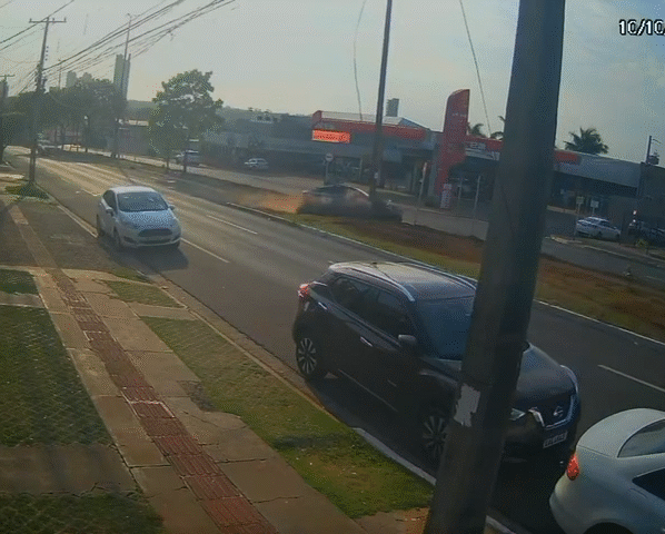As imagens mostram o carro em alta velocidade antes de invadir o canteiro e atingir o poste, que desabou sobre a pista segundos depois. Por sorte, o equipamento caiu exatamente entre dois veículos estacionados, sem atingir nenhum deles. A frente do carro ficou destruída, e a roda dianteira direita se soltou com a força da colisão.