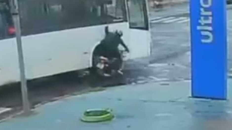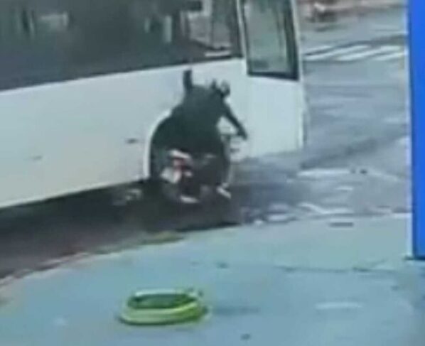 Imagens de uma câmera de segurança de uma empresa de gás registraram o momento exato em que o motociclista é atingido no cruzamento com a Rua Zakia Naras Siufi. Com o impacto, ele foi lançado para debaixo do coletivo.